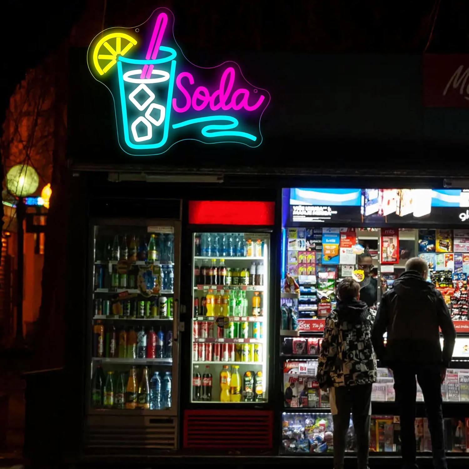• Unique Design: Soda neon sign showcases a refreshing soda drink with ice cubes and a lemon slice, along with the bold Soda lettering. The vibrant colors and appetizing soda imagery create a cool, inviting beverage themed atmosphere. Soda lovers and those into lively decor will be instantly drawn to it. It’s ideal as soda wall art to bring a refreshing, fizzy touch to spaces like diners, soda shops, or home kitchens.