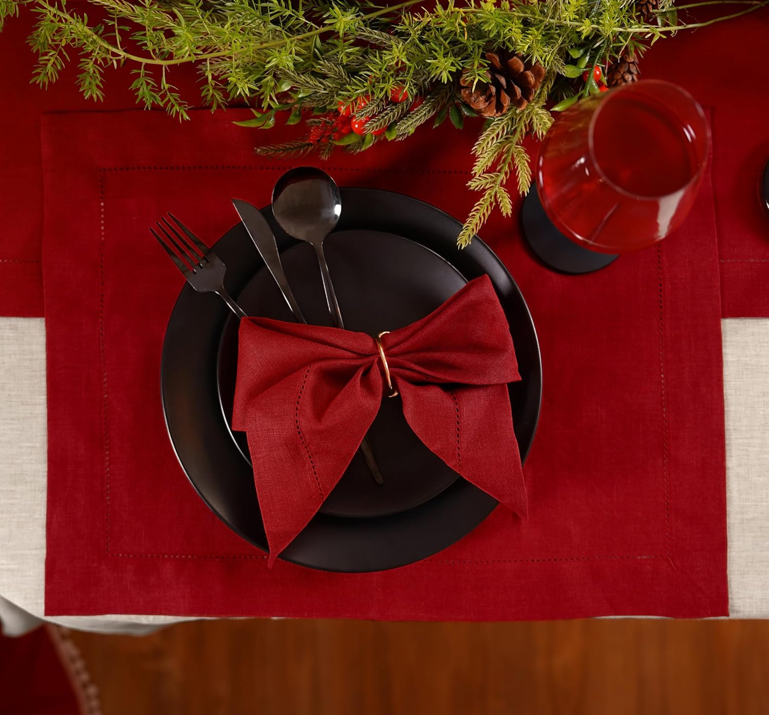 100% Pure Linen Red Placemats 14 x 19 Inch - Hemstitch Christmas Placemats Set of 4 – Elegant Cloth Fabric Table Mats for Winter, Thanksgiving & New Year Décor – Elara Collection