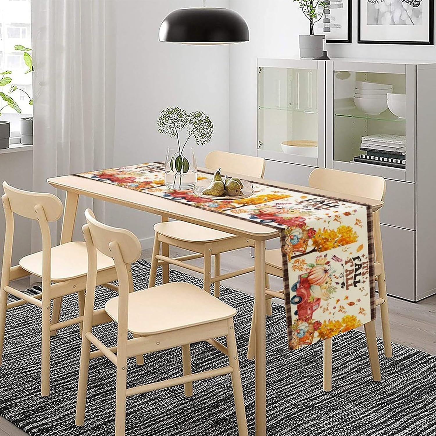 Fall Pumpkin Table Runner,Rustic Maple Yellow Leaf Trees Truncks Brown Plaid Tablecloth Burlap for Hotel Indoors Outdoor Dining Room Kitchen Home Decor,W13X L80 in