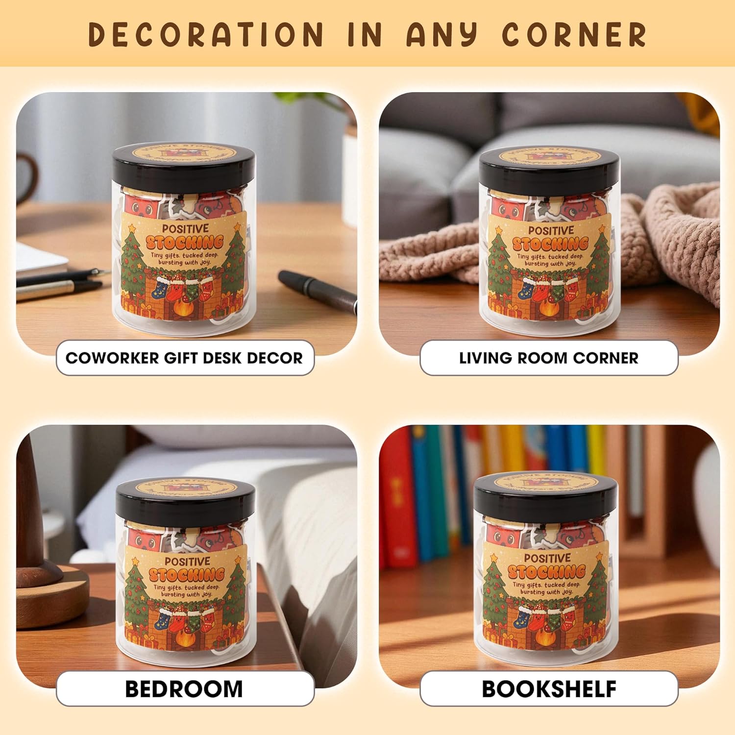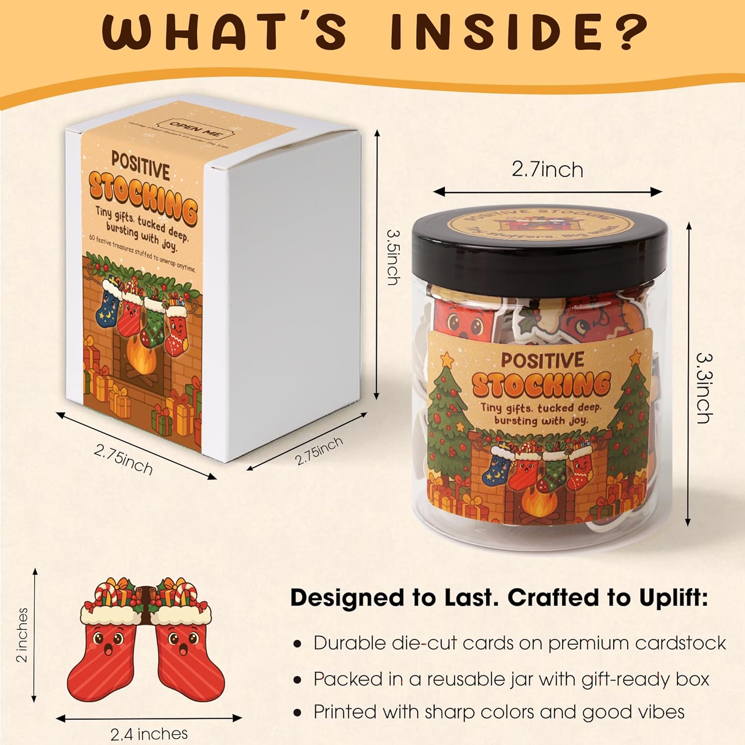 • 🎁 The Ultimate Feel-Good Gift This Positive Stocking Jar is packed with 60 cheerful notes to boost joy, ease stress & bring laughs—perfect christmas gifts for teens and women who need a holiday pick-me-up. Whether you’re looking for stocking stuffers for teen girls or stocking stuffers for women, this positive Stocking jar will brighten anyone’s day.