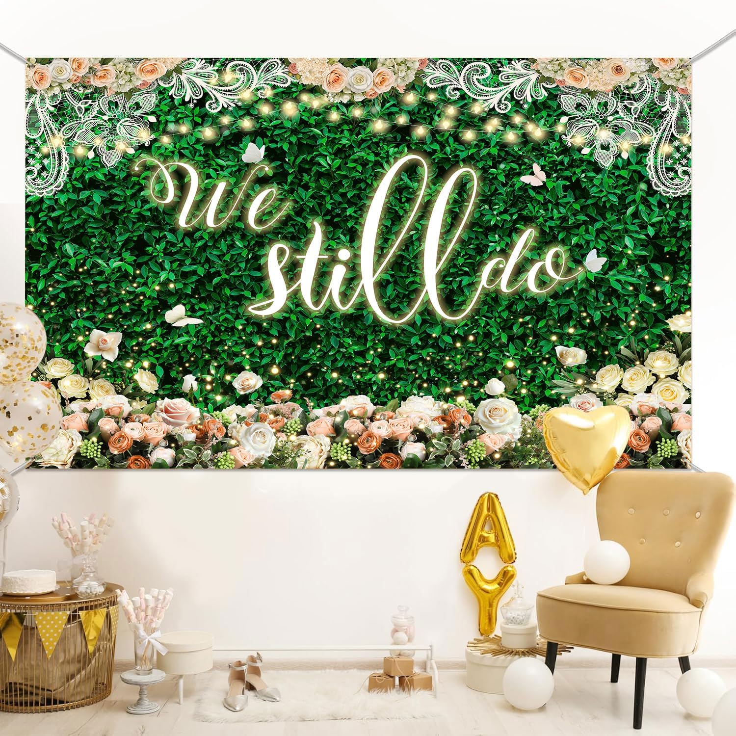 We Still Do Backdrop Green Leaves Lace Wedding Anniversary Photography Background Engagement Vow Renewal Bachelorette Party Decoration Banner Photo Booth Studio Props 9x6ft FU064YL